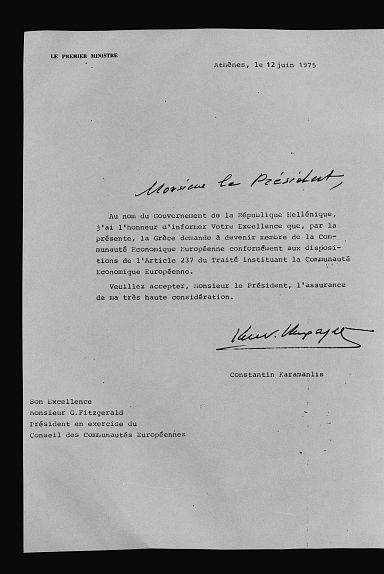 Το ξέσπασμα της δικτατορίας των συνταγματαρχών το 1967 διέκοψε τις ενταξιακές διαδικασίες, οι οποίες αναβίωσαν το 1975, όταν ο Κωνσταντίνος Καραμανλής υπέβαλε επισήμως το αίτημα ένταξης της Ελληνικής Δημοκρατίας στην ΕΟΚ. Οι διαπραγματεύσεις άρχισαν το 1976 και ολοκληρώθηκαν το 1979.