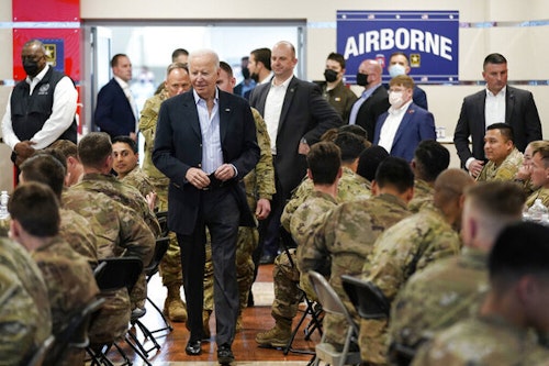 Επισκέφτηκε αμερικανική μεραρχία που αναπτύχθηκε στην ανατολική πτέρυγα του ΝΑΤΟ για να ενισχύσει την αμερικανική στρατιωτική παρουσία ενάντια στην εισβολή της Ρωσίας στην Ουκρανία